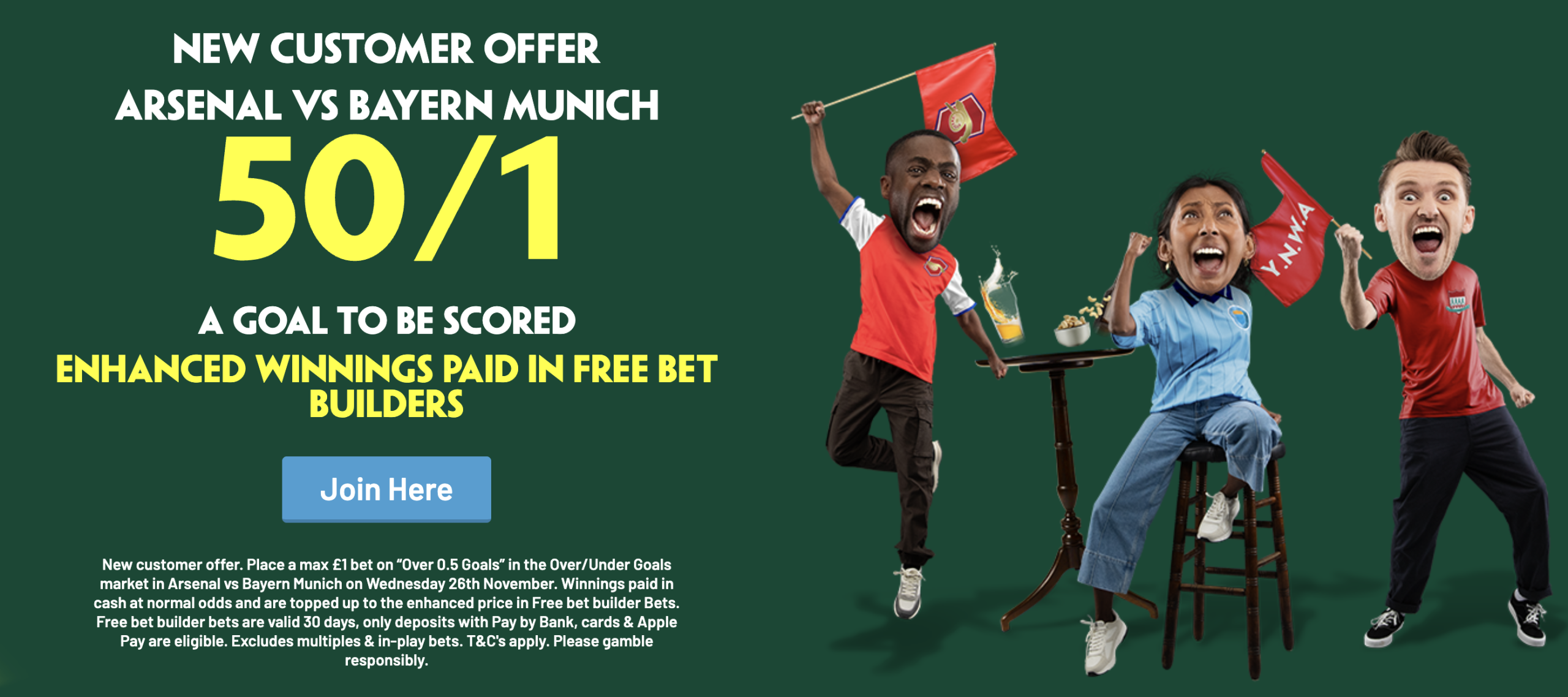 New customer offer. Place a max £1 bet on “Over 0.5 Goals” in the Over/Under Goals market in Arsenal vs Bayern Munich on Wednesday 26th November. Winnings paid in cash at normal odds and are topped up to the enhanced price in Free bet builder Bets. Free bet builder bets are valid 30 days, only deposits with Pay by Bank, cards & Apple Pay are eligible. Excludes multiples & in-play bets. T&C's apply. Please gamble responsibly.