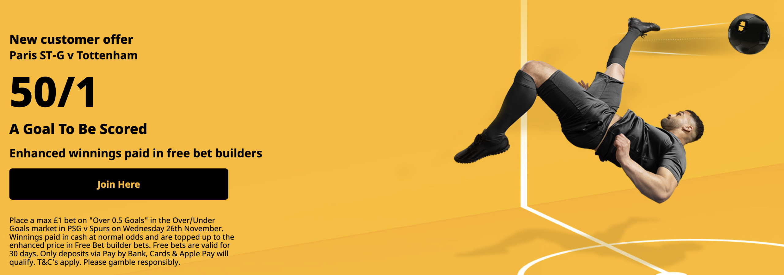 Place a max £1 bet on "Over 0.5 Goals" in the Over/Under Goals market in PSG v Spurs on Wednesday 26th November. Winnings paid in cash at normal odds and are topped up to the enhanced price in Free Bet builder bets. Free bets are valid for 30 days. Only deposits via Pay by Bank, Cards & Apple Pay will qualify. T&C's apply. Please gamble responsibly.